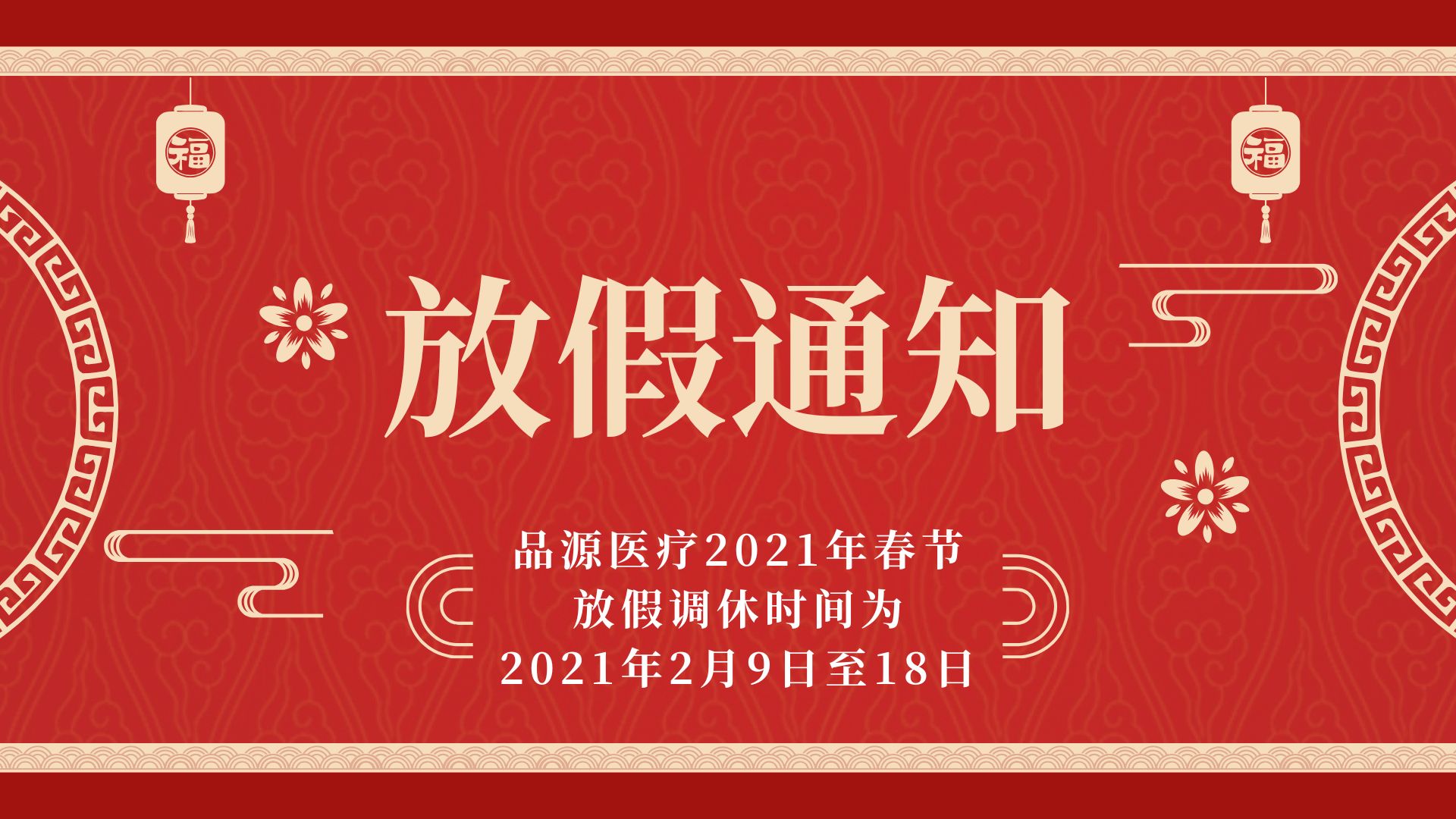 品源醫療2021年春節放假時間:2月9日-2月18日,2月19日(大年初八)上班,預祝各位合作伙伴新年快樂,牛年大吉!